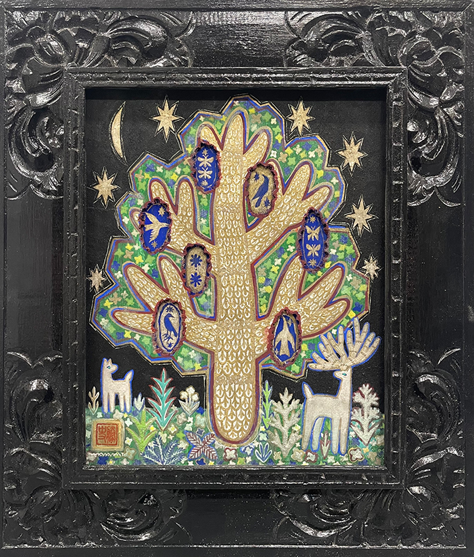 パネルに寒冷紗、岩絵具、白土、金属箔、染料