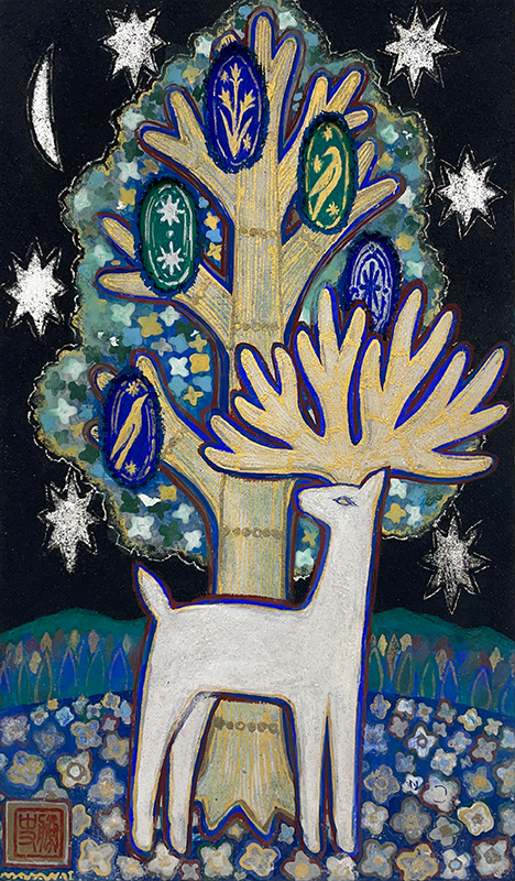 パネルに寒冷紗、岩絵具、白土、金属箔、染料、板