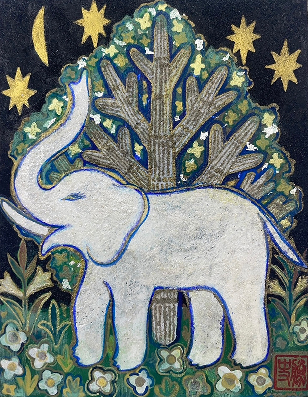 パネルに寒冷紗、岩絵具、白土、金属箔、染料、板