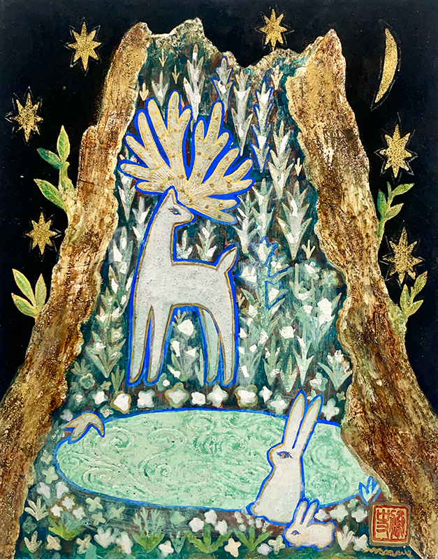 パネルに寒冷紗、岩絵具、白土、金属箔、染料、板