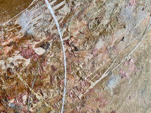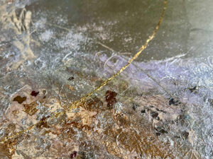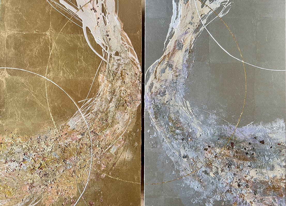 箔押し紙(真鍮、アルミ)、アルキド樹脂、金箔、真鍮箔、アルミ箔、銅箔、和紙、岩絵具、蓄光顔料